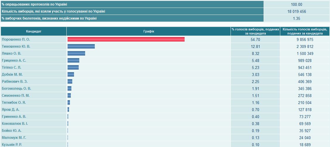 По итогам обработки 100% протоколов, Петр Порошенко победил в первом туре и набрал 54,7 %, за него проголосовали 9856911 украинцев.